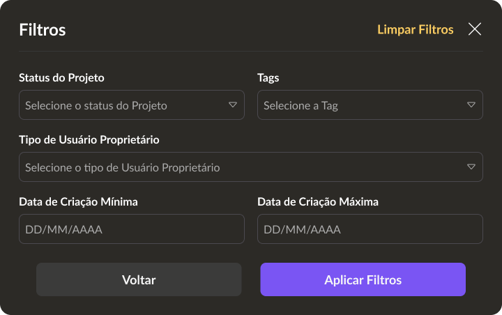 <figure><img src="https://3094770693-files.gitbook.io/~/files/v0/b/gitbook-x-prod.appspot.com/o/spaces%2FUDAW8OhFeBrf24AjPbyD%2Fuploads%2Ff2gEABMzpERh0CrESS59%2FFiltro%20Projetos.png?alt=media&#x26;token=5295e9ce-732f-47b2-8609-a6e19f44fd61" alt=""><figcaption></figcaption></figure>